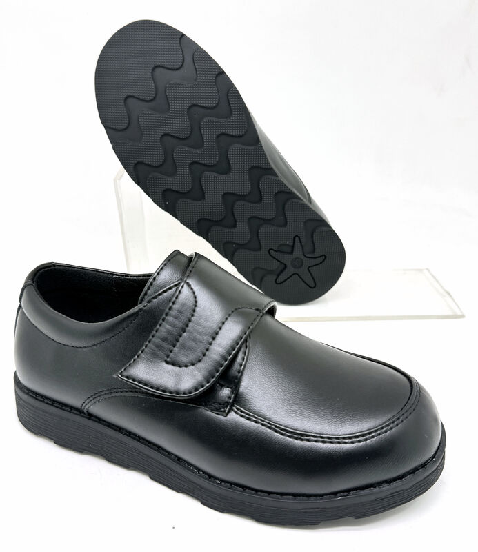 Give your child the perfect blend of comfort, durability, and classic style for school with these premium leather school shoes. Designed for both boys and girls, these shoes feature a high-quality smooth black leather upper that is easy to clean and maintain, ideal for busy school days. The wide, adjustable hook-and-loop strap ensures a secure, custom fit, making it easy for kids to put on and take off independently, while the soft, padded interior and roomy toe box provide all-day comfort for running, playing, and sitting in class. The thick, non-slip rubber outsole with a wavy tread pattern delivers excellent traction on all surfaces, preventing slips and falls on playgrounds, hallways, and wet floors. The timeless black design perfectly matches school uniforms, formal outfits, and casual wear, making these shoes a versatile essential for every child's wardrobe.